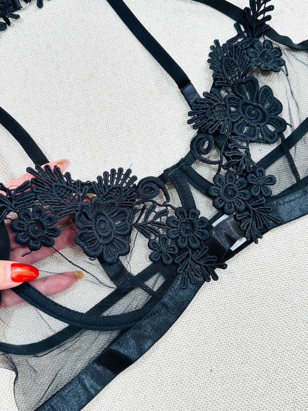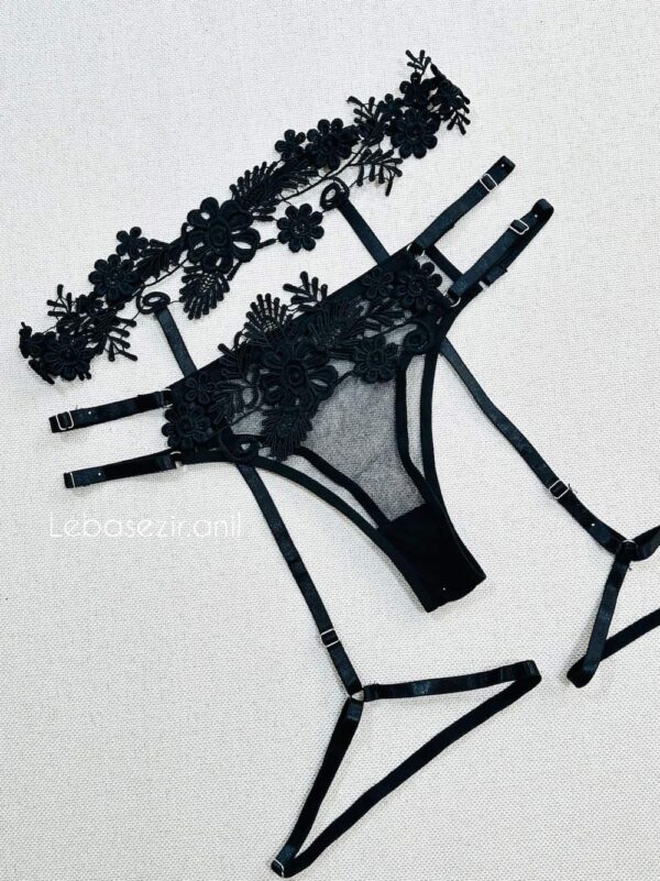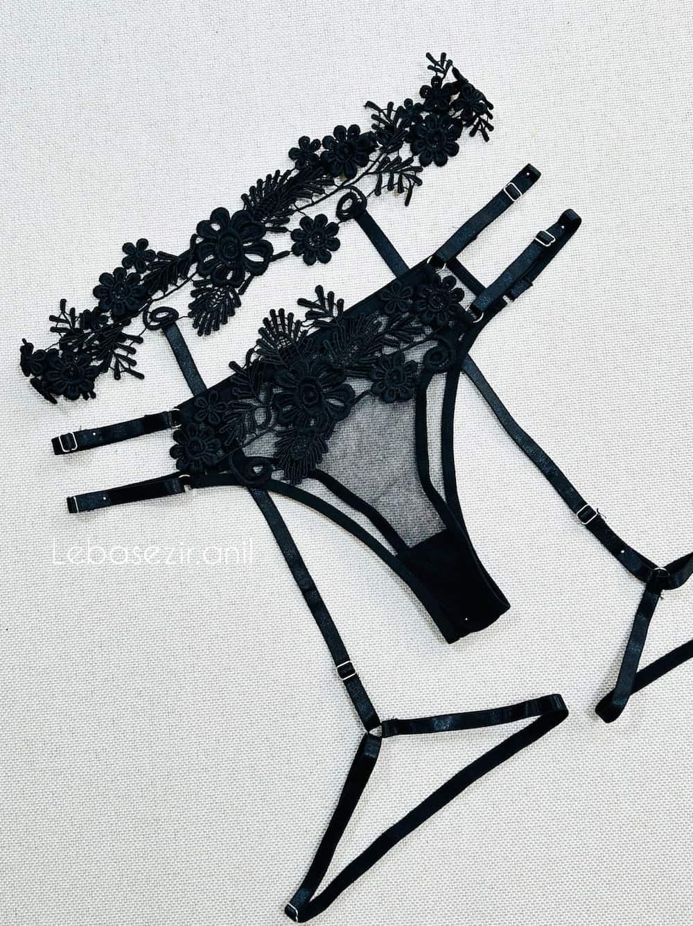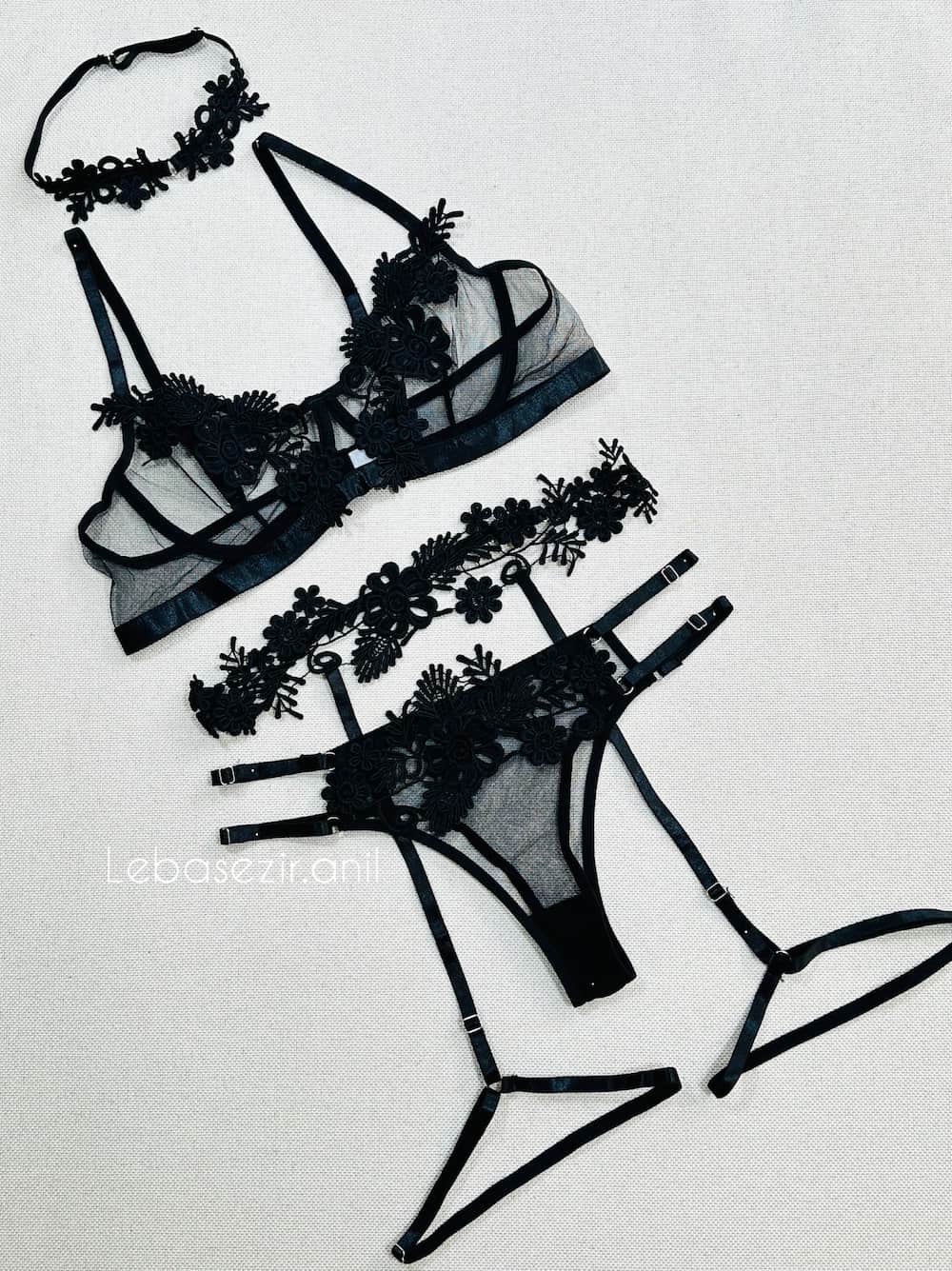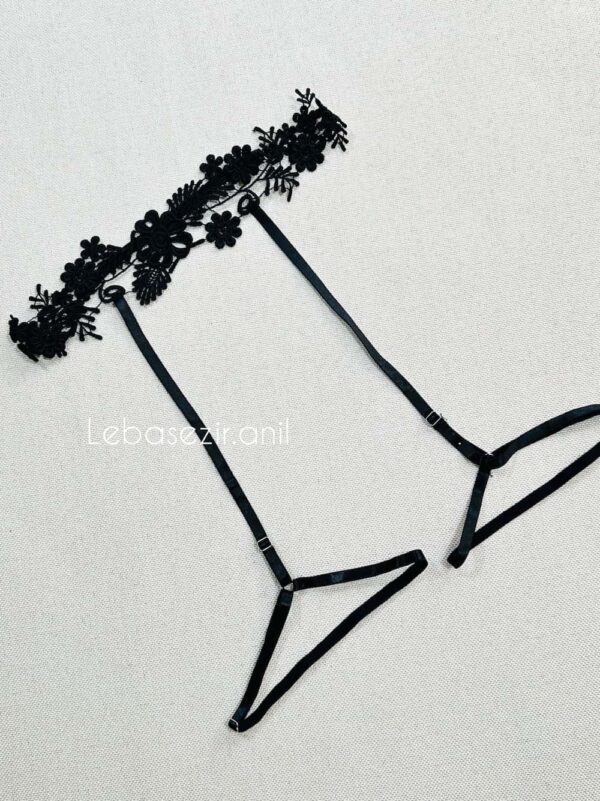 - پایین تنه: شورت و گارتر کمر و دور ران تور طرح گل و بوته, بند شورت قابل رگلاژ