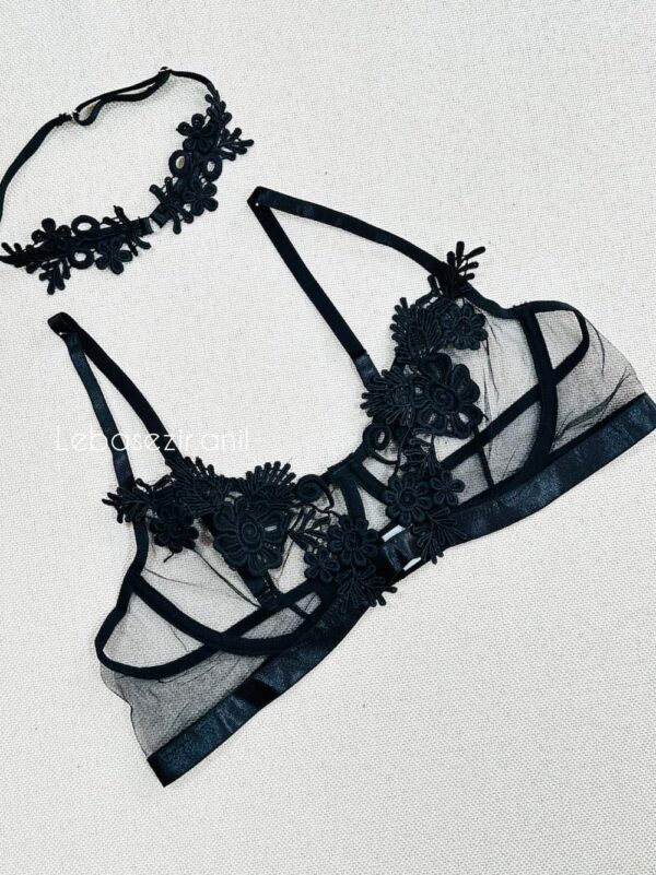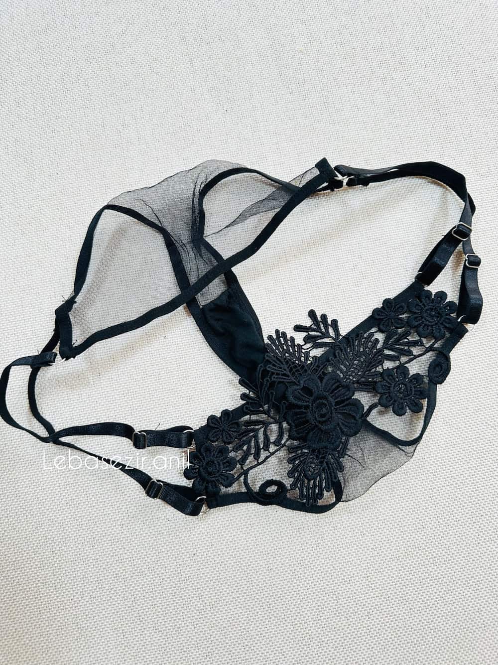 - بالا تنه: بند ها قابل رگلاژ و تور طرح گل و بوته